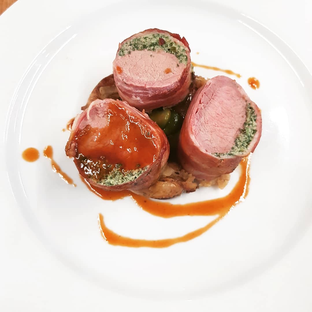 - Main: Cannon of Quantock spring lamb, wrapped in pancetta and mint mousseline, crushed new potatoes and baby broad beans